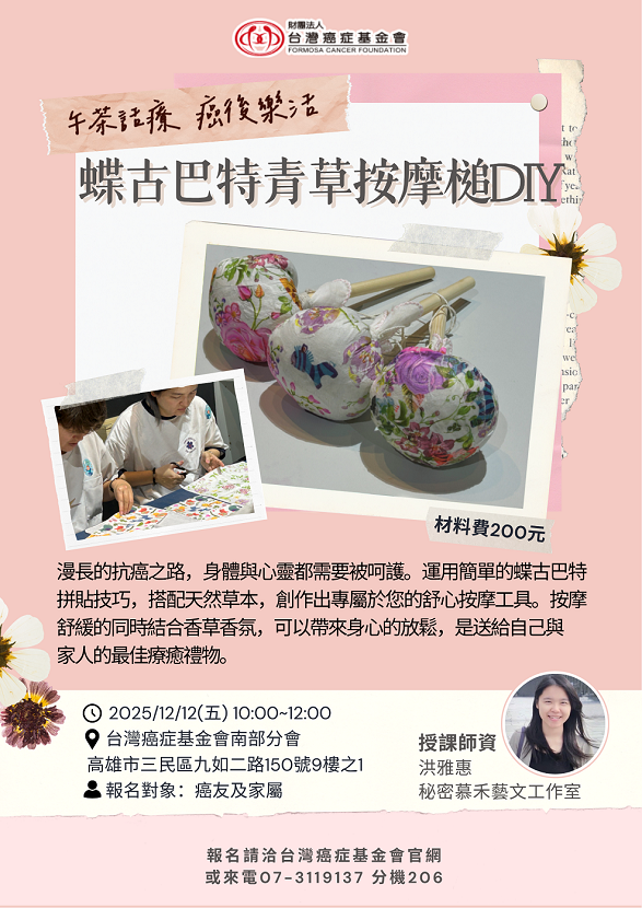 【高雄午茶話療講座】蝶古巴特按摩青草槌DIY(11/05開始報名)